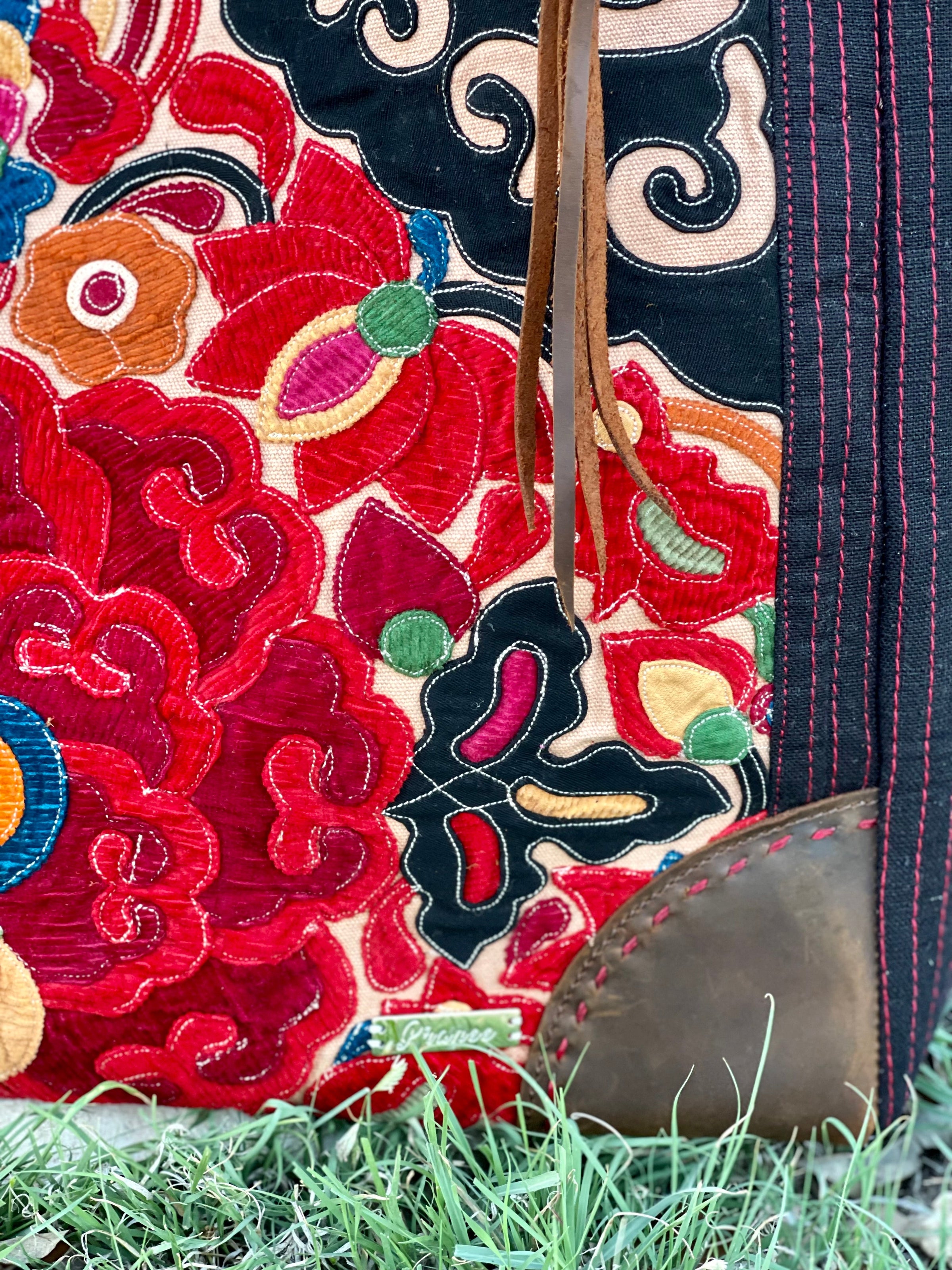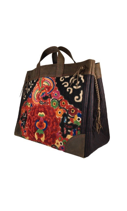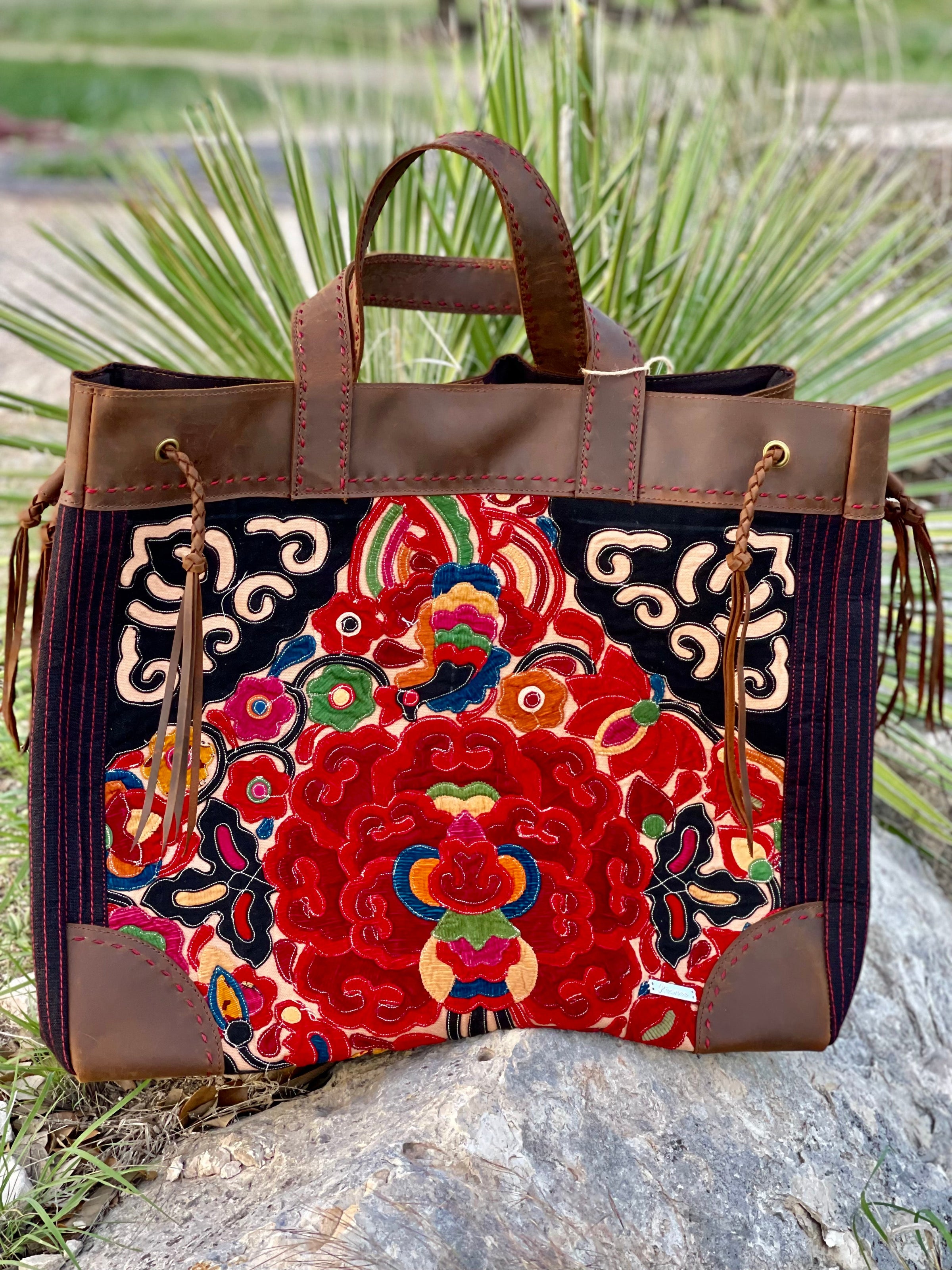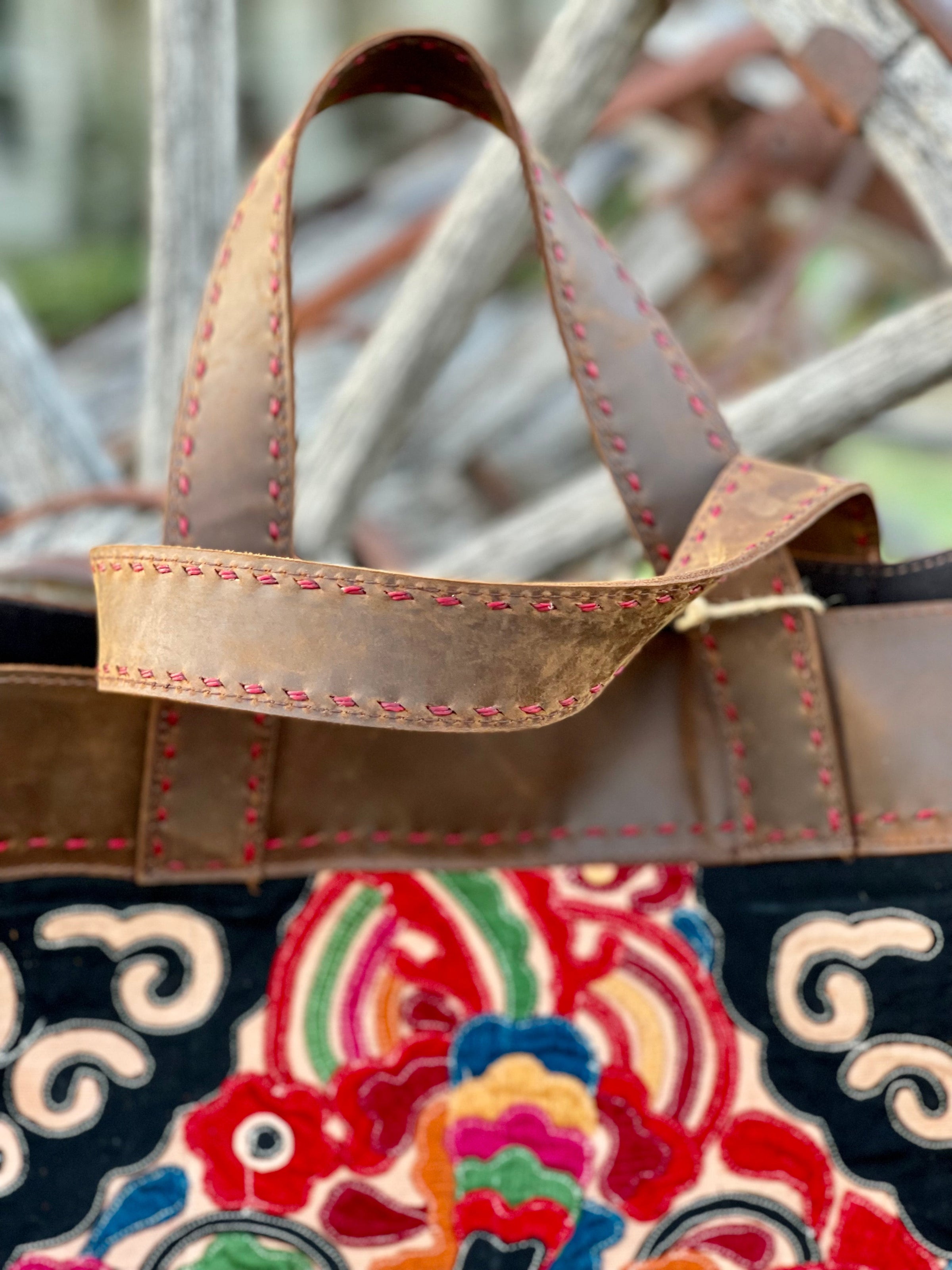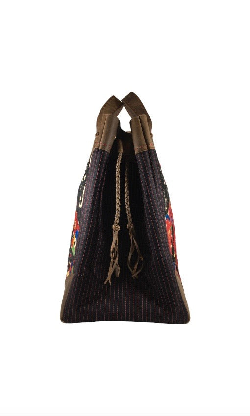 Franklin, from the Brooklyn Collection, is an oversized tote bag that is stylish and practical. A must-have for a weekend away or a day at the farmer's market. Hand-sewn applique is paired with black pinstriped hemp fabric with leather accents. Interior pockets help keep you organized and your phone and keys easily accessible.