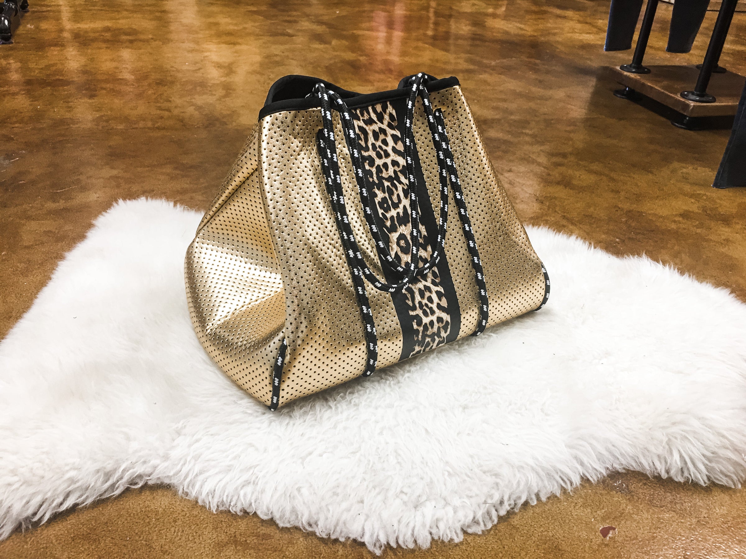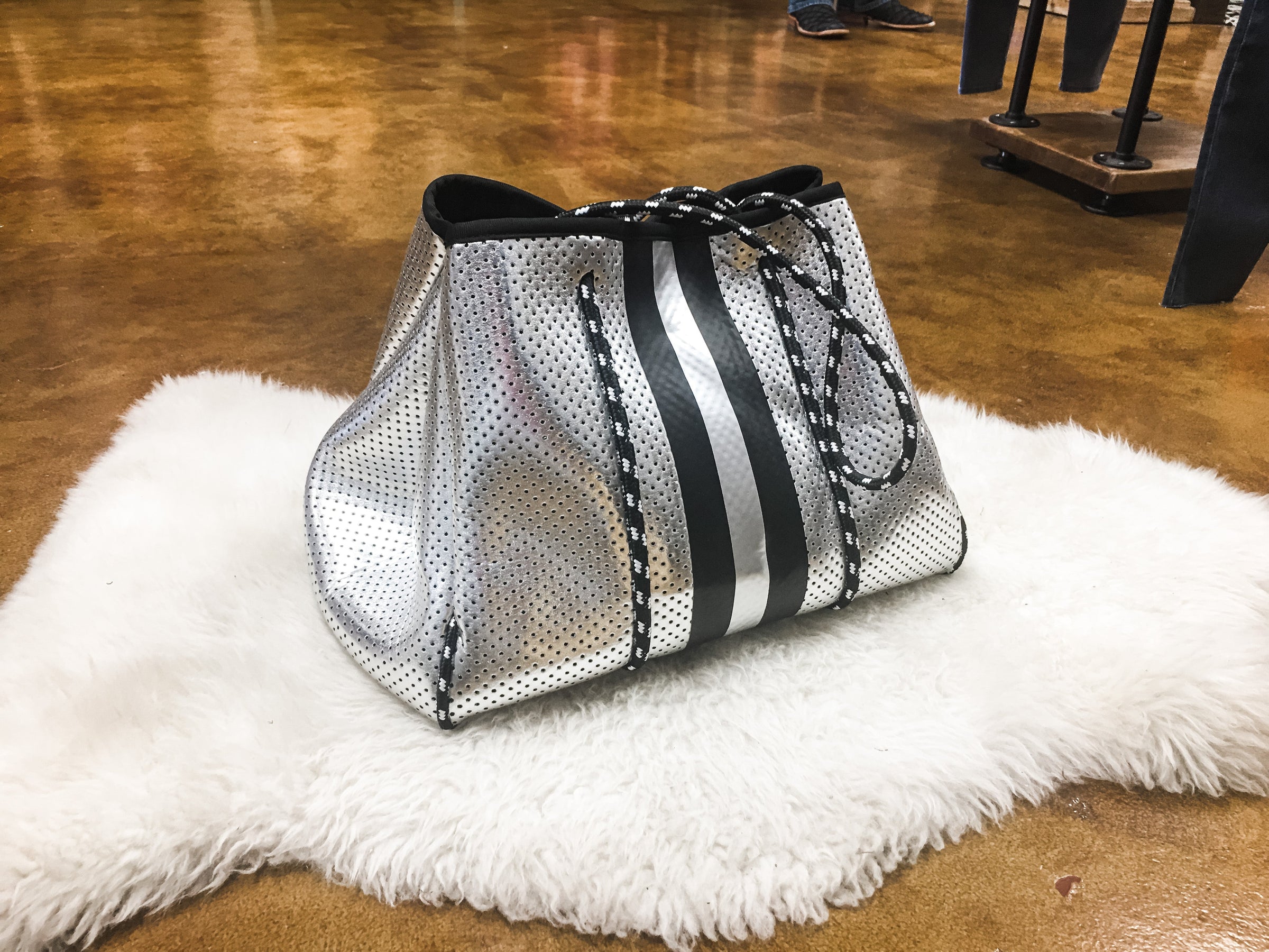 Super cute and classy neoprene bag. Grab this bag and you can be prepared with drinks and snacks for all those sports events. Expandable with magnetic side snaps, Two internal zipper pockets and a top magnetic snap. Small removable bag inside for personal items.