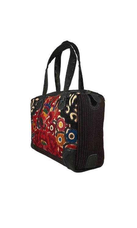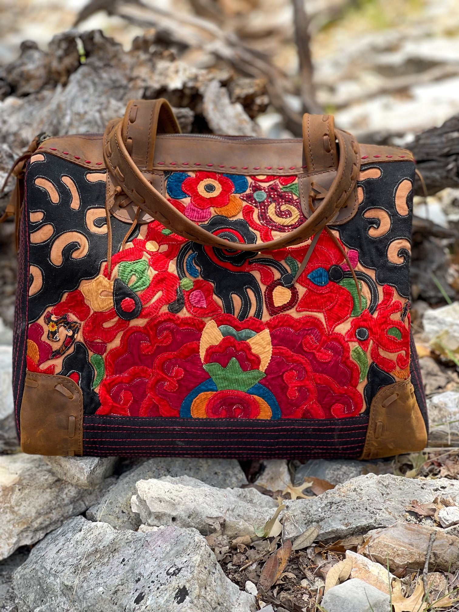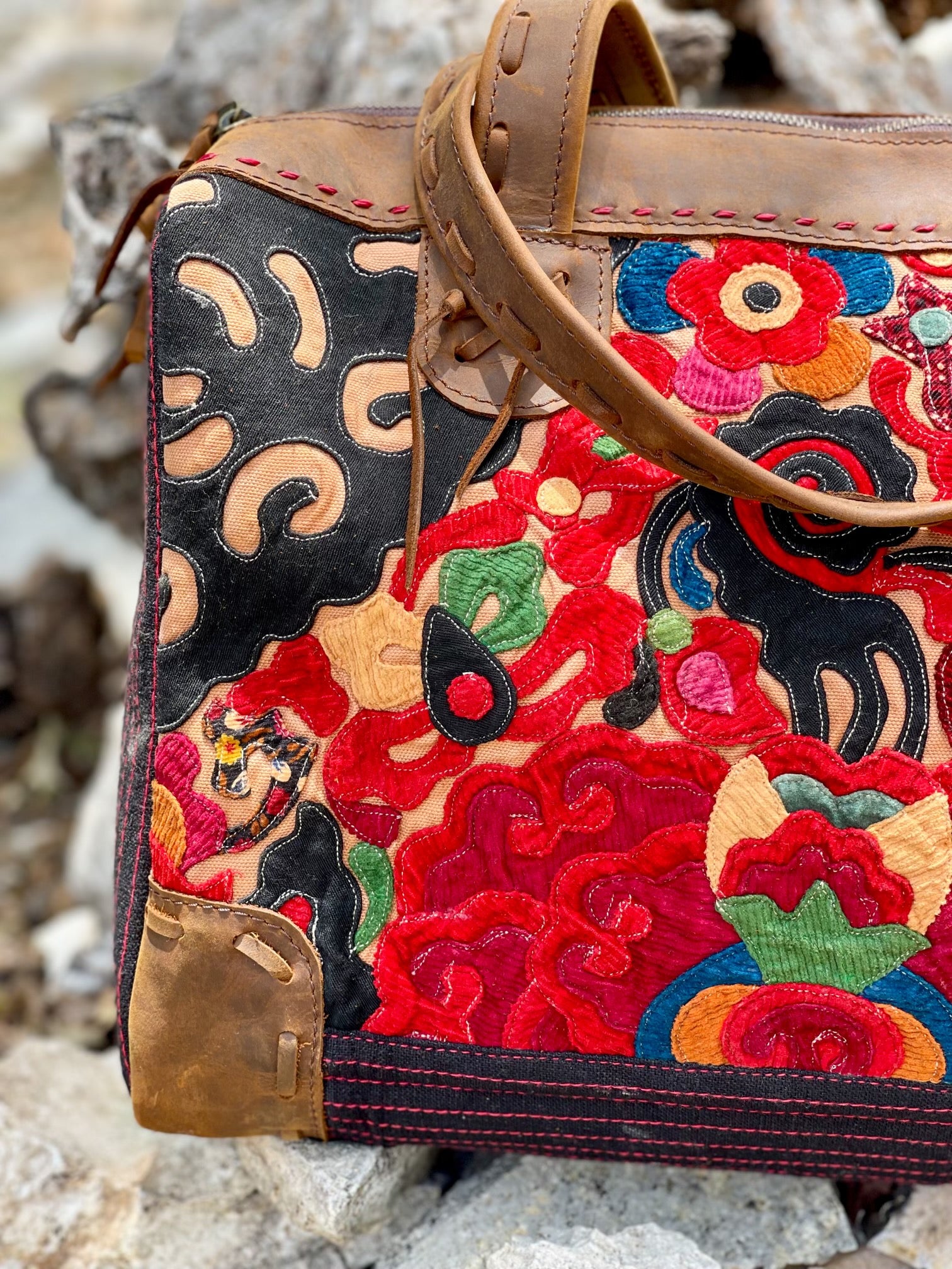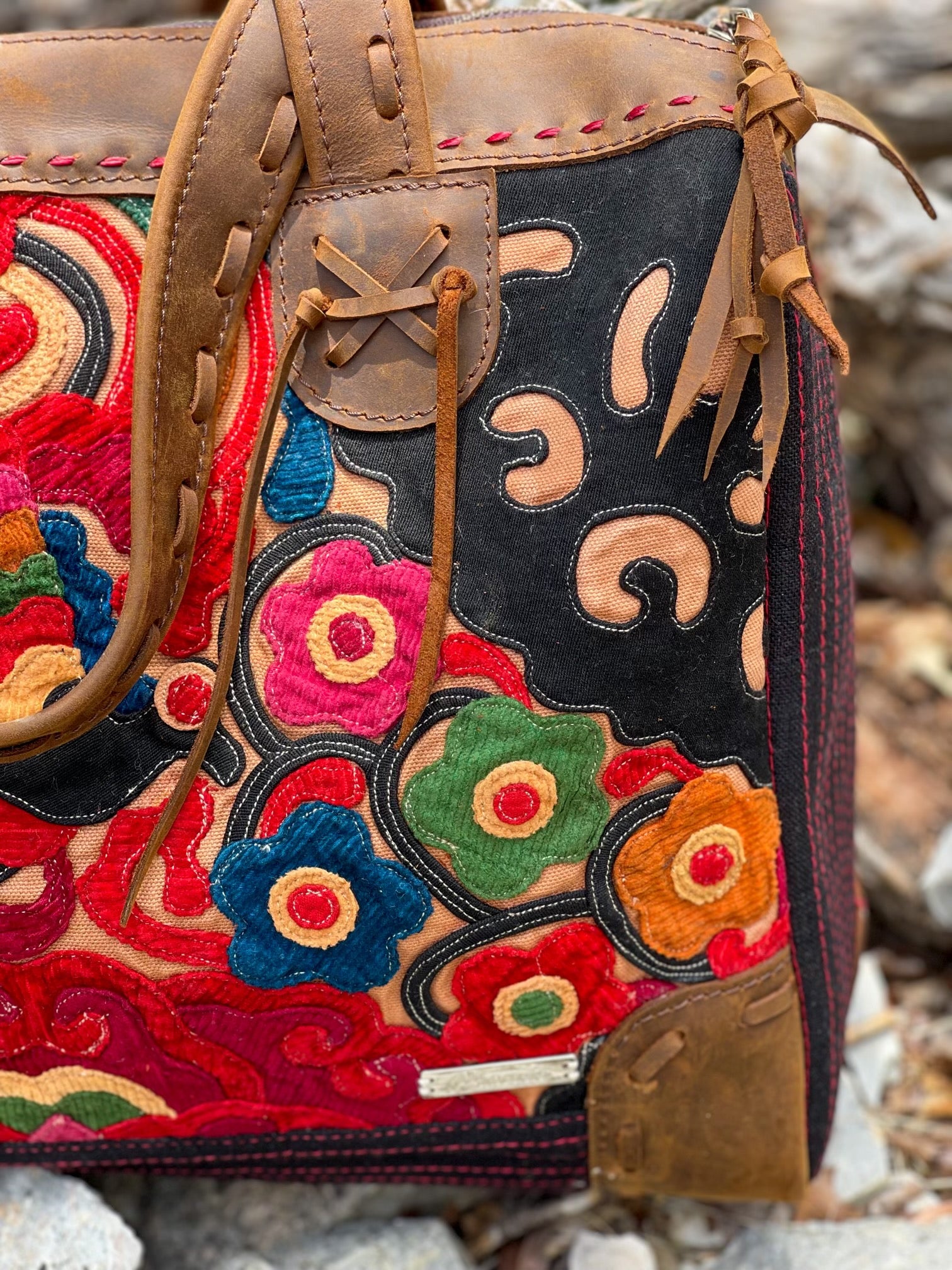 Willow, from the Brooklyn Collection, is a beautiful and stylish handbag. Pair it with the Whitney Weekender for the perfect travel set. Our bold hand-sewn applique is paired with black pinstriped hemp fabric with leather accents. Interior pockets help keep you organized and your phone and keys easily accessible.