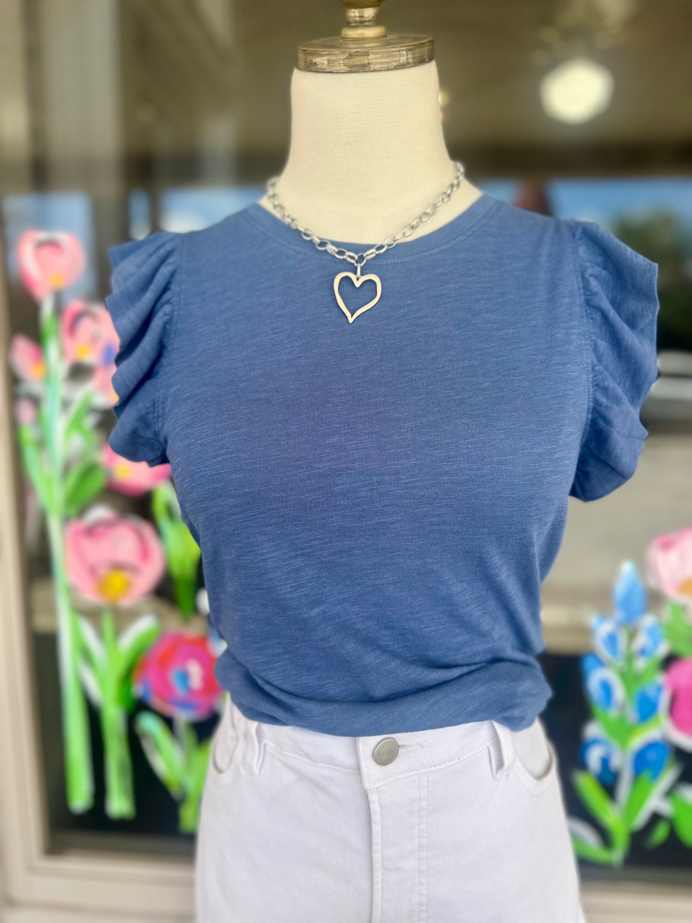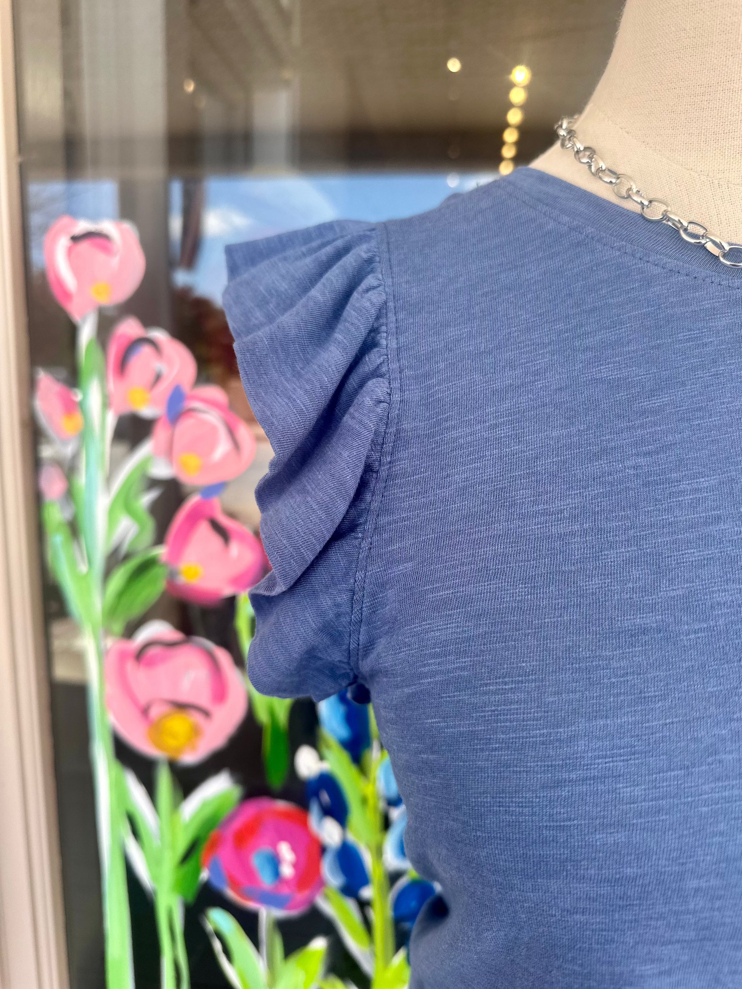 Ruffle trimmed top in slubby material, crew neck finished sleeveless. Here to rock! colorful thread spectrum brightens any mood... Solid color knit on standard fit.