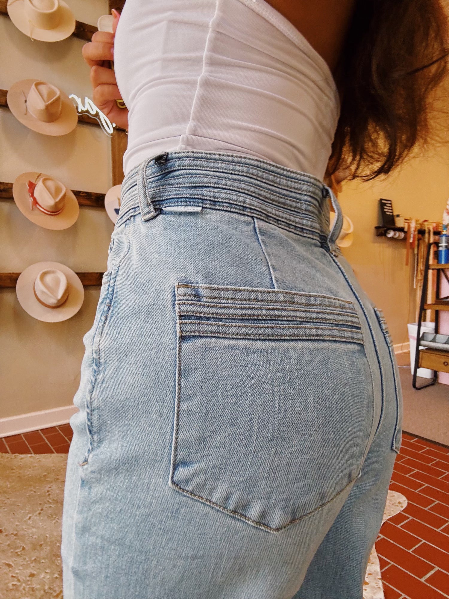 Super high rise straight leg jeans. Designed precision, they sit just a touch lower on the waist and effortlessly follow a straight, easy line from the hip to mid-thigh. Crafted from comfort stretch denim with a full inseam, these jeans boast intricate details, back dart support, double button closure, multi-piping accents at the waist and pocket hem, hand-sanded hip whiskers, subtle waistband and pocket grinding, as well as tailor-pressed seam lines, every aspect is meticulously crafted. Washed in an effortless shade complementing any ensemble.