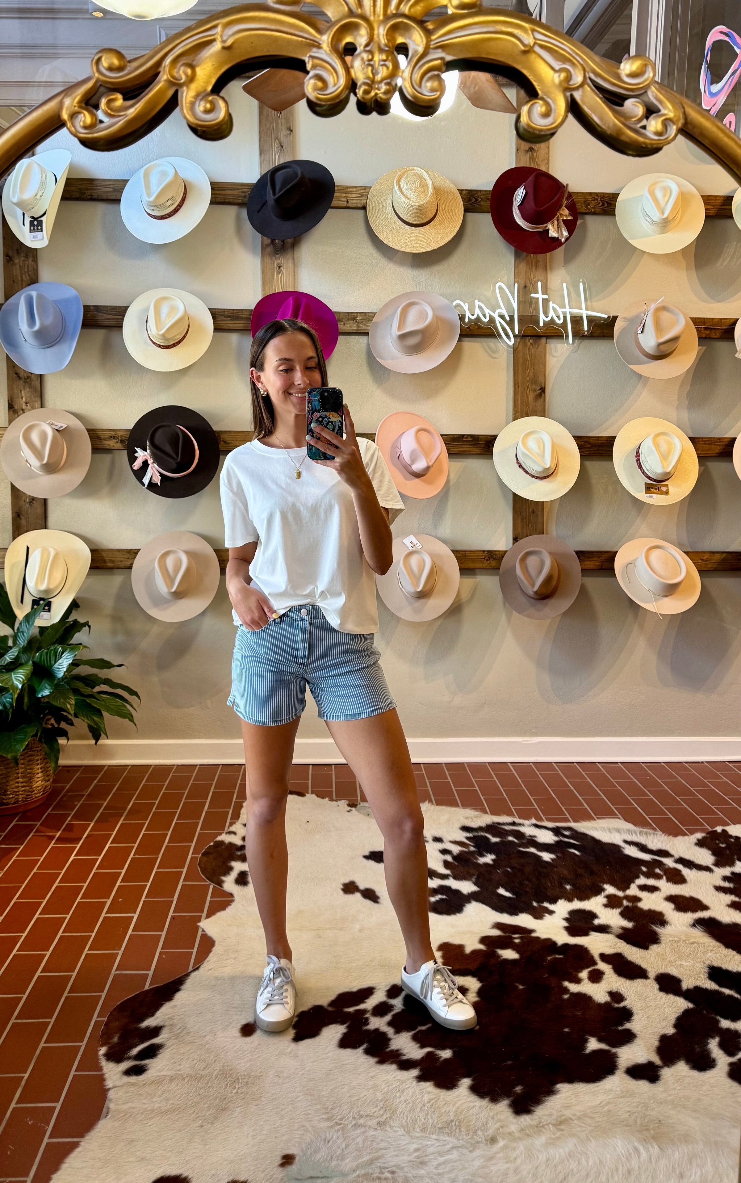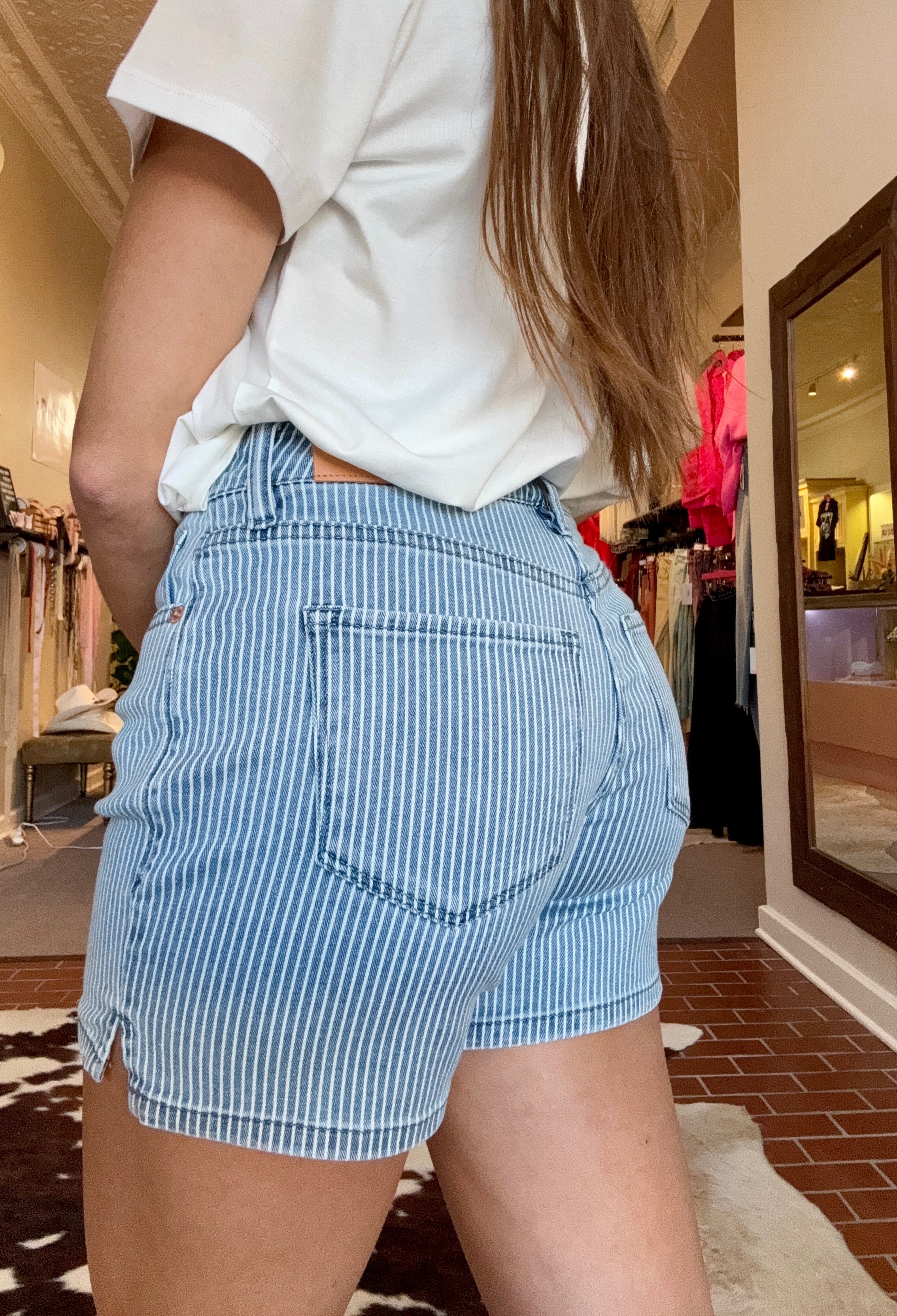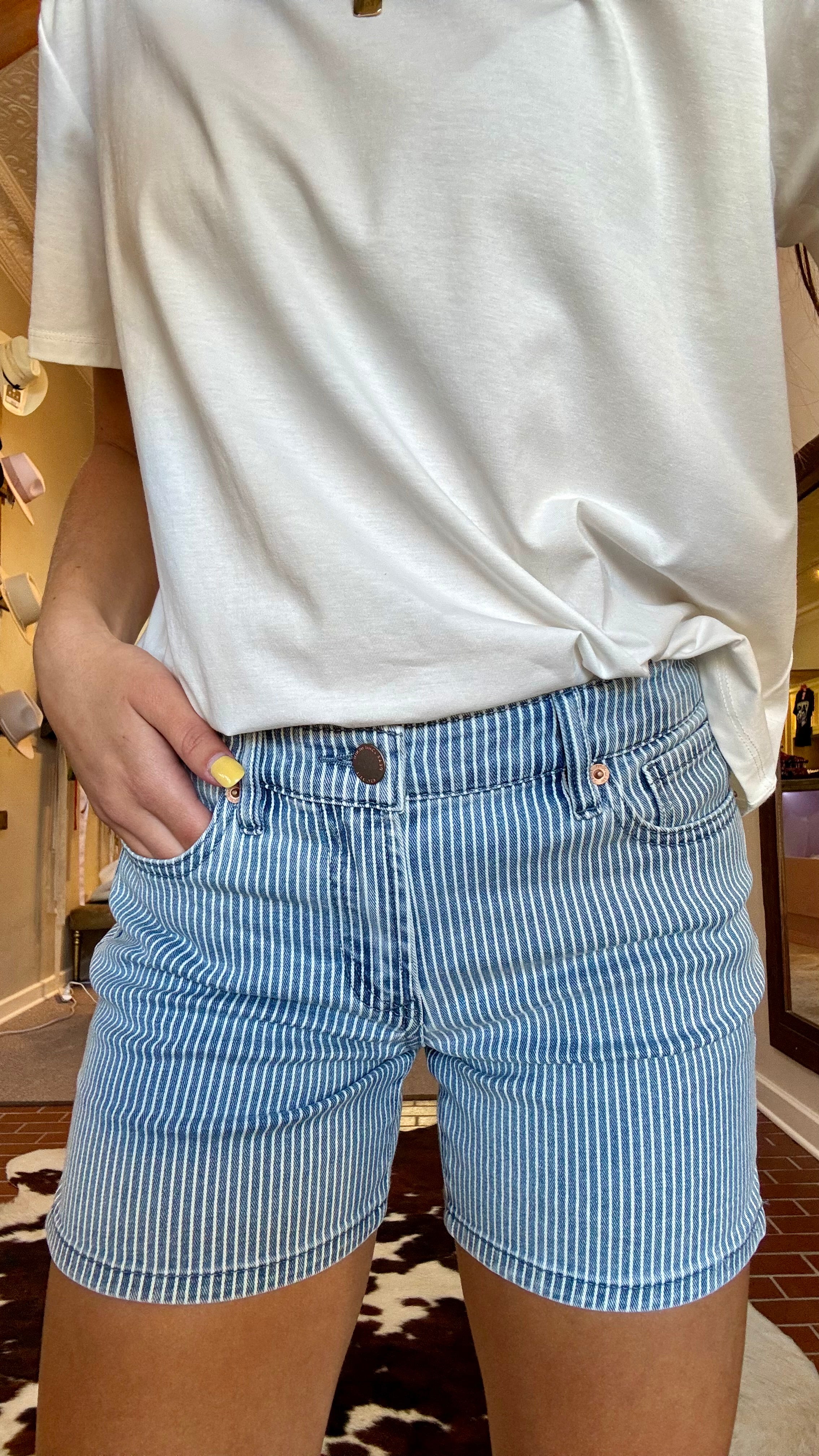 Elevate your spring and summer style with our Dear John Julian Indigo Stripe Shorts! The perfect mom short with a 5 inch inseam, their high rise and stretchy fabric provides a flattering fit. Don't settle for ordinary, stand out with the unique stripe pattern.