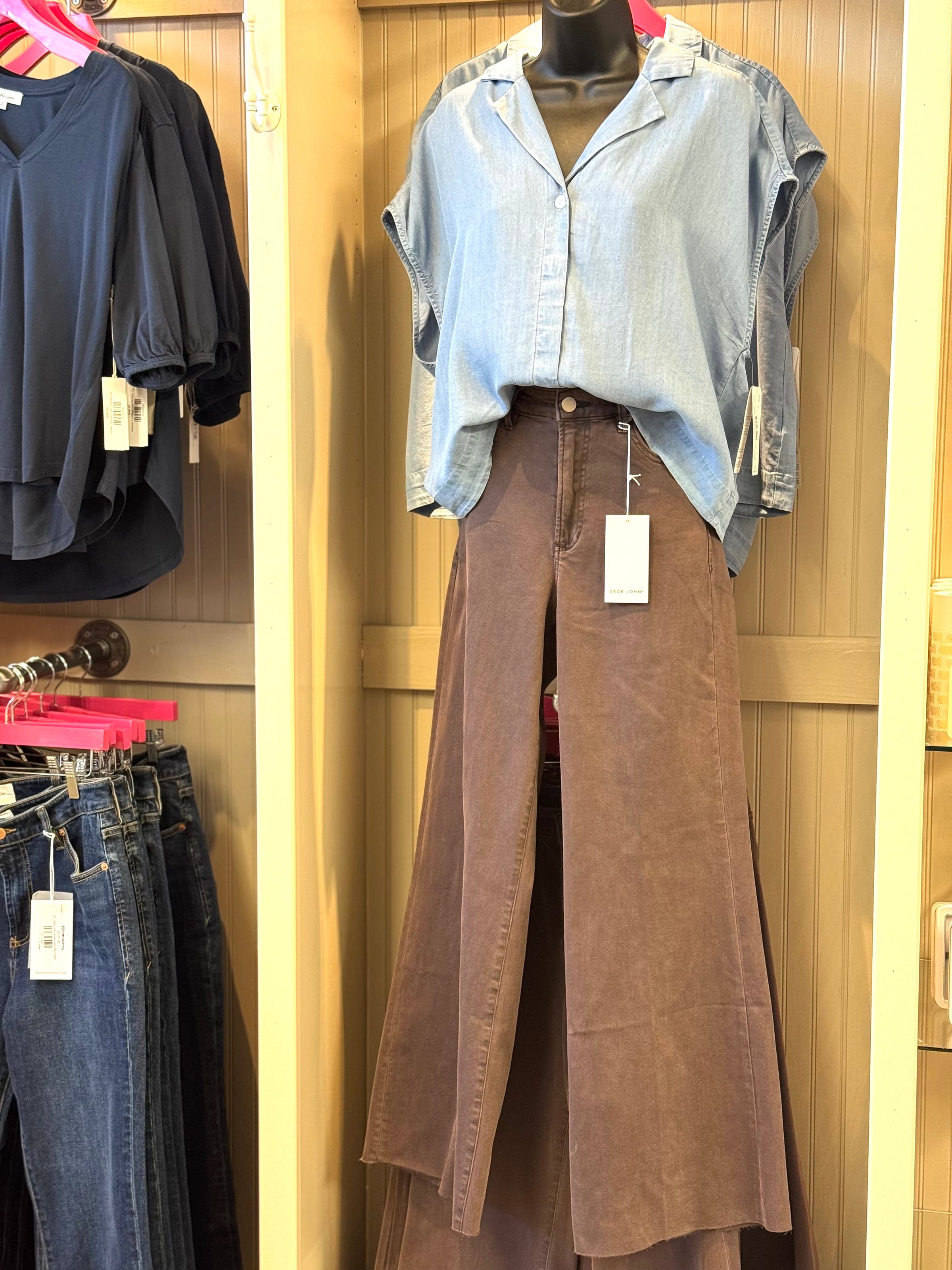Full inseam on stretch denim featuring cut-off hem details add flair to these soft pants, available in designer colors, and finished with a center inseam press for a tailored look