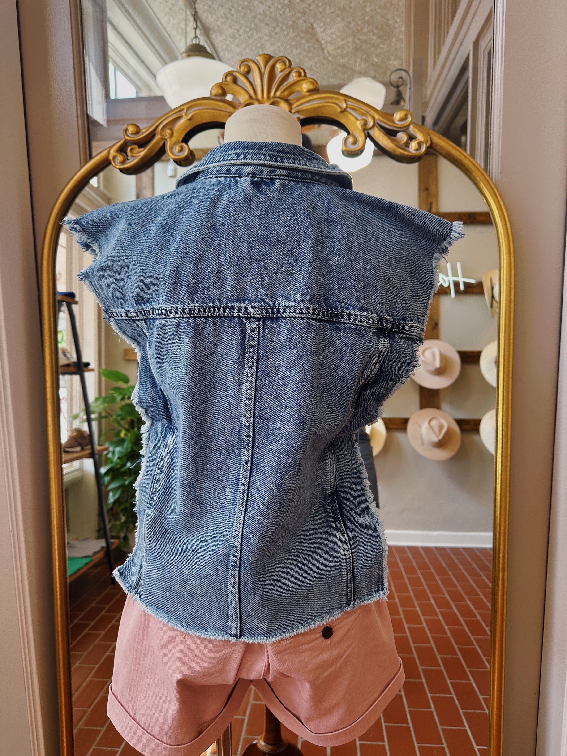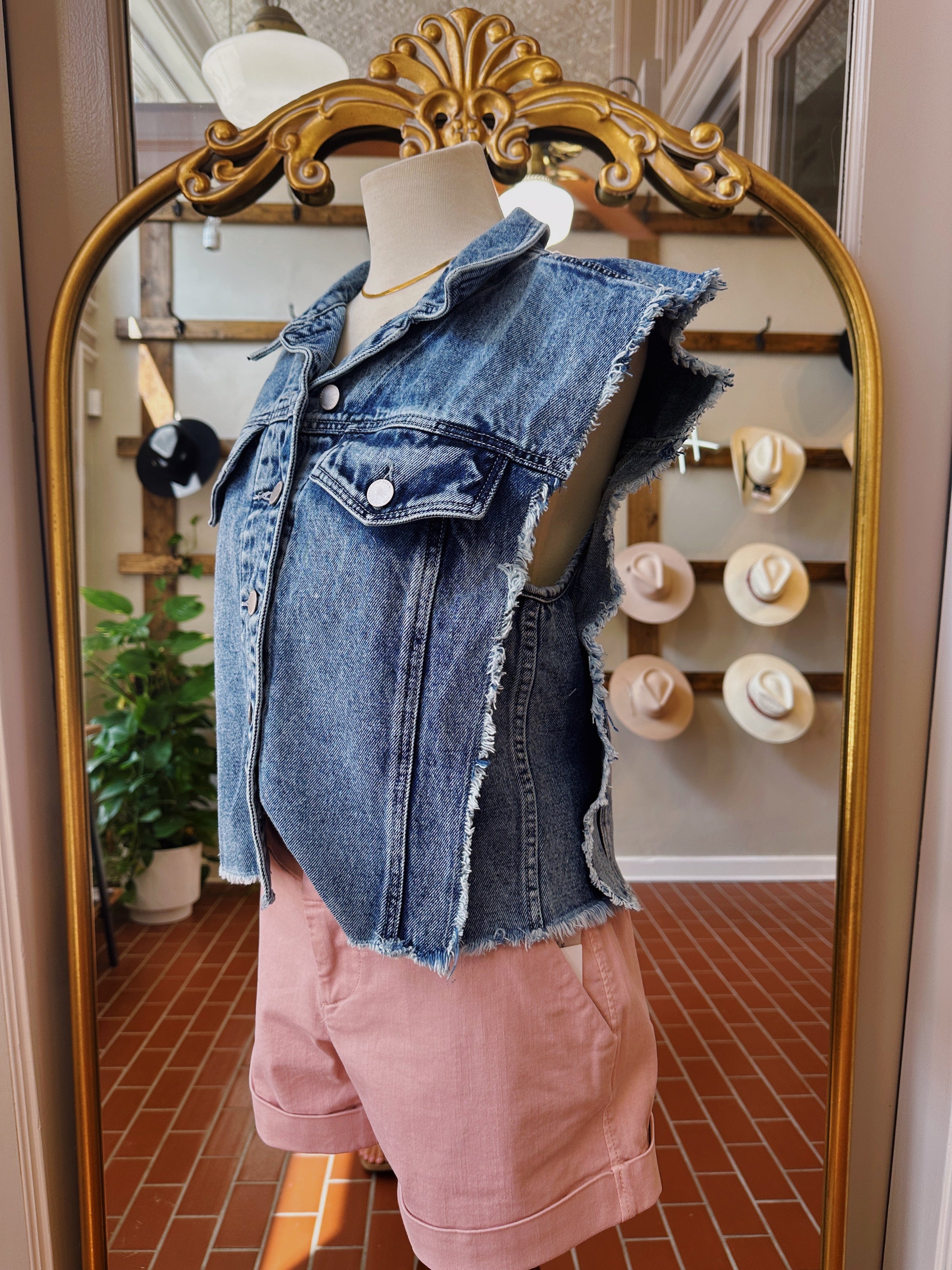 The Dear John Melody Vest is a stylish denim piece featuring a classic front button closure and a sharp collar detail. Its frayed edges add a playful, edgy touch that elevates any outfit. Perfect worn alone or layered over a fitted basic, this vest effortlessly combines casual cool with versatile charm.