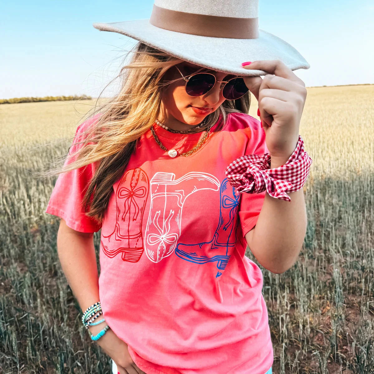 Stay stylish in the Red White & Boots garment dyed tee! Perfect for any patriotic event, this comfy tee features red, white, and blue boots. Show off your country pride while being fashion-forward. (Yee-haw!)