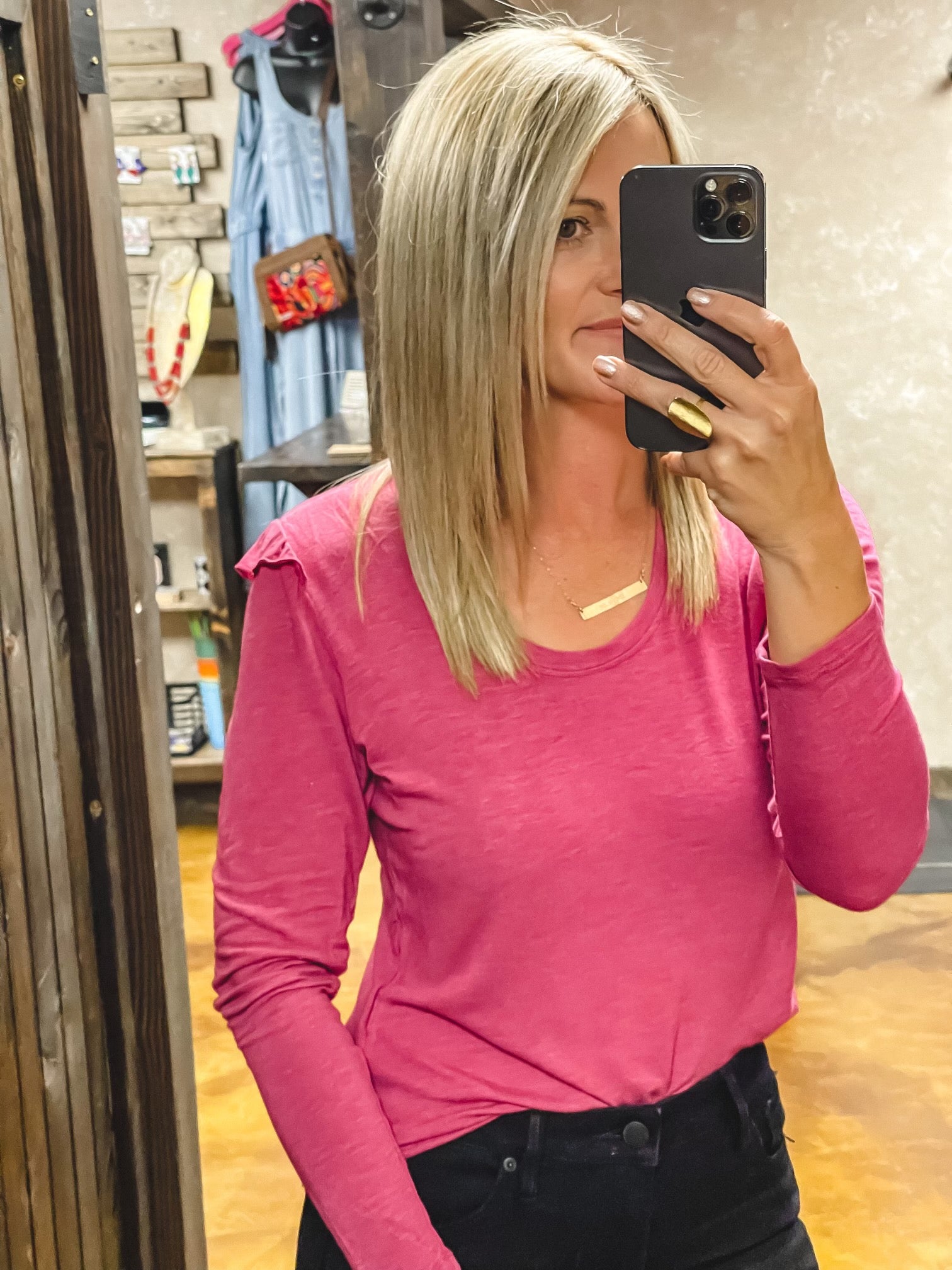Another Love Crystal long sleeve scoop neck tee with ruffle along the top of the shoulder. The ruffle adds a dressy touch to this top which makes it a great top for any occasion. Pairs well with our Dear John Laney High rise Black jeans.