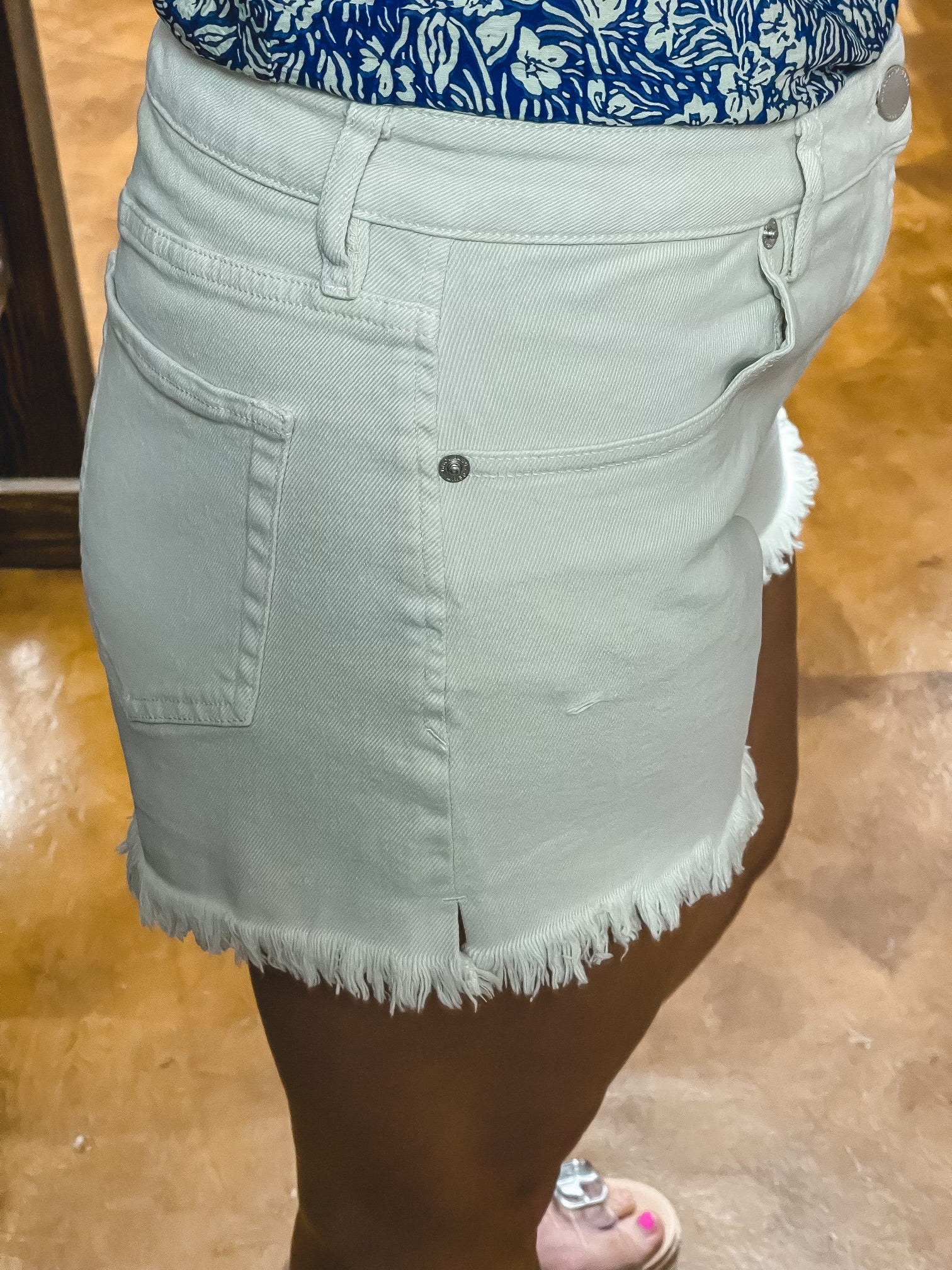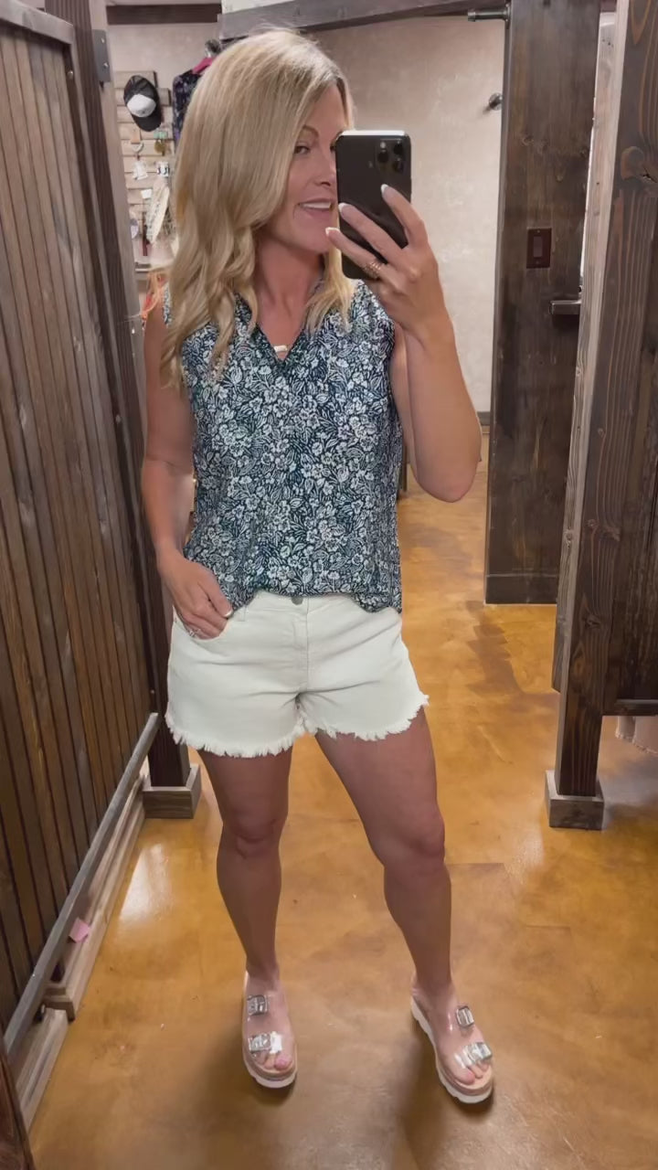 Super high rise shorts boyfriend style cut off denim. It's the true fit that sits at natural waist and fitted in the hip and thigh. Shorts inseam on comfort stretch denim accented with designer tonal color blocks, frayed hem opening.