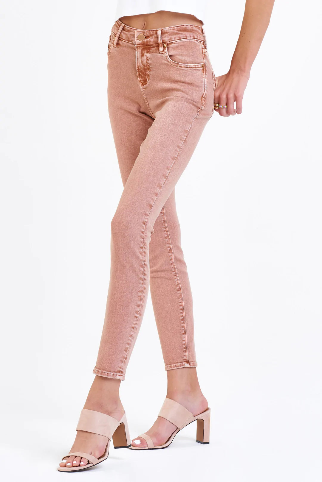 High rise ankle skinny jeans. It's the stunning fit that sits slightly lower on the waist and fitted skinny in the hips through the leg. Ankle inseam on stretch denim with designer color palettes, washed and brushed for softness.