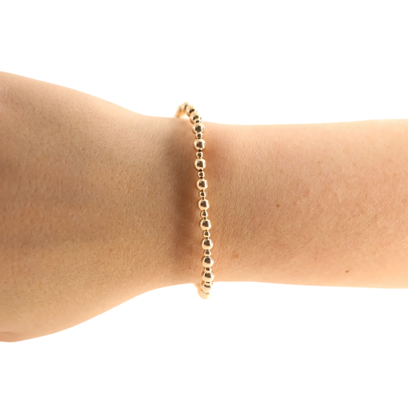 The combination of the 4mm and 2.5mm gold-filled beaded bracelet is sure to make a statement. Beautiful stacked with the other bracelets. Material: 14 K gold filled beads and durable elastic string so perfect for everyday wear! Sweat proof, water proof and tarnish free!