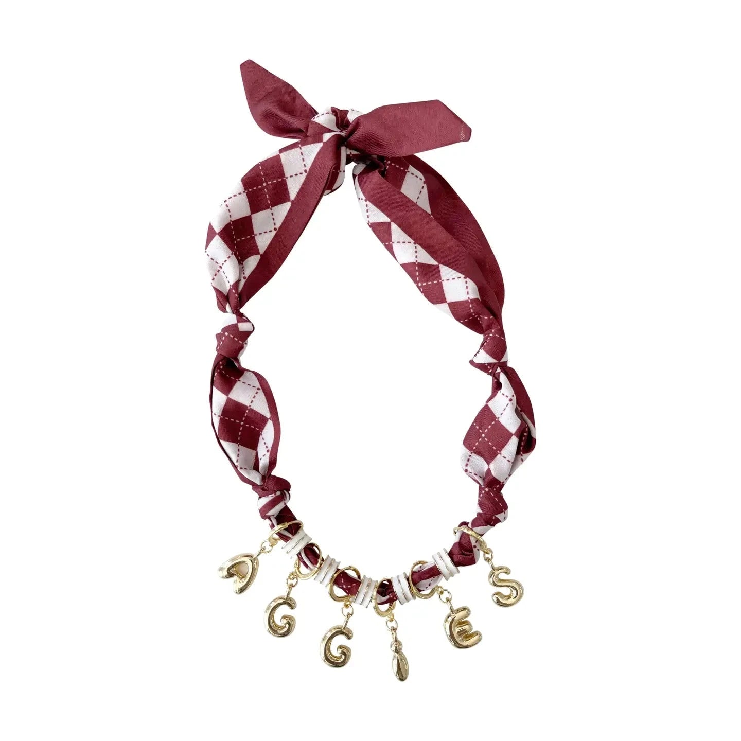 Show off your school spirit in style with our Aggie scarf necklace, featuring bold 18k gold plated bubble letter charms and coordinating 18k gold plated spacers. This unique accessory combines a soft satin fabric with luxe gold details for a fun, spirited look that’s perfect for game day or any day.