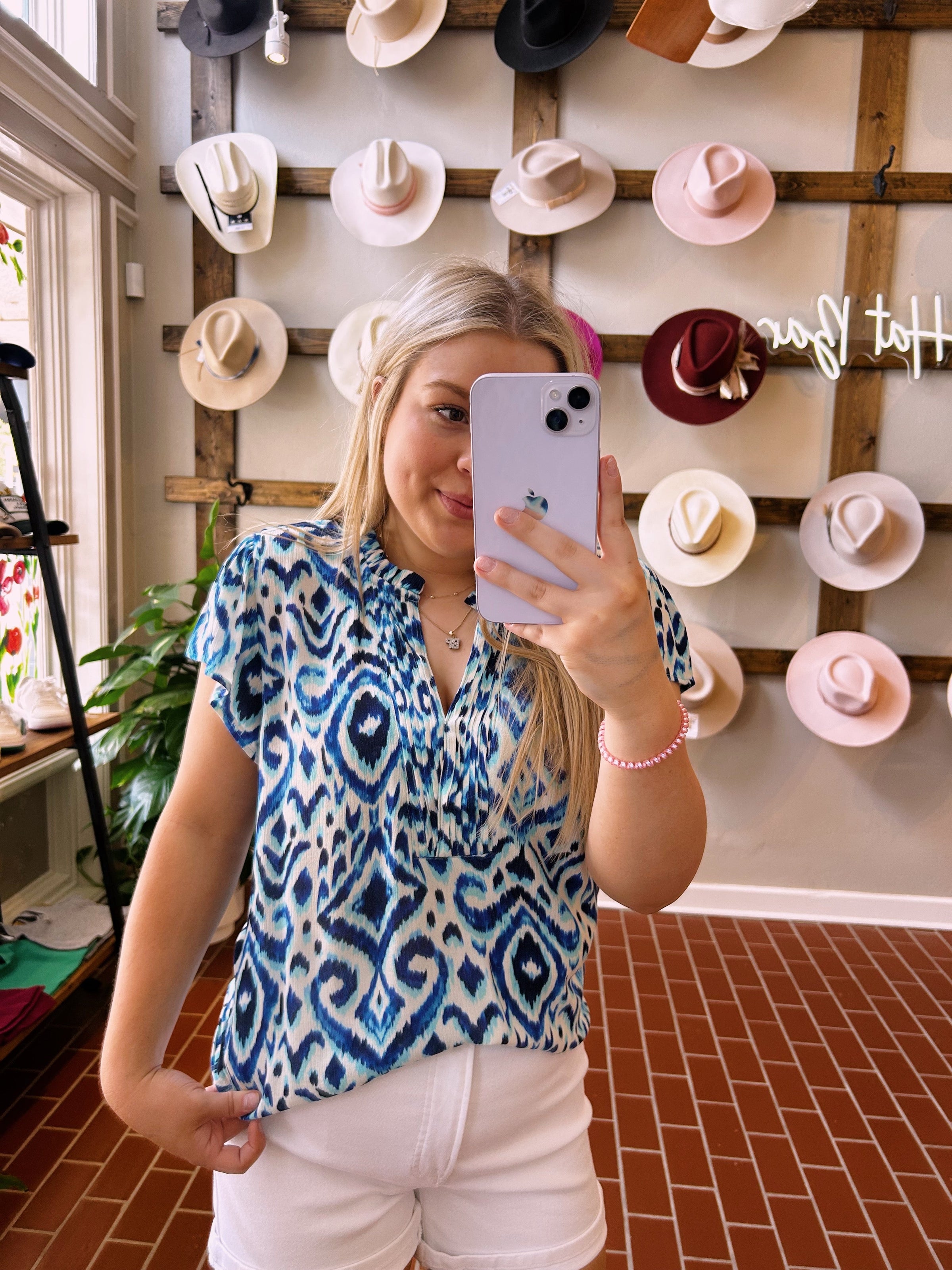 Get ready for vacation with our Another Love Blair Top! This vibrant top features stunning blue tones that pair perfectly with white denim for a summery look. With a flattering v neckline and delicate ruffle details, this top is both stylish and comfortable. Made with 100% rayon, it's perfect for warm weather.