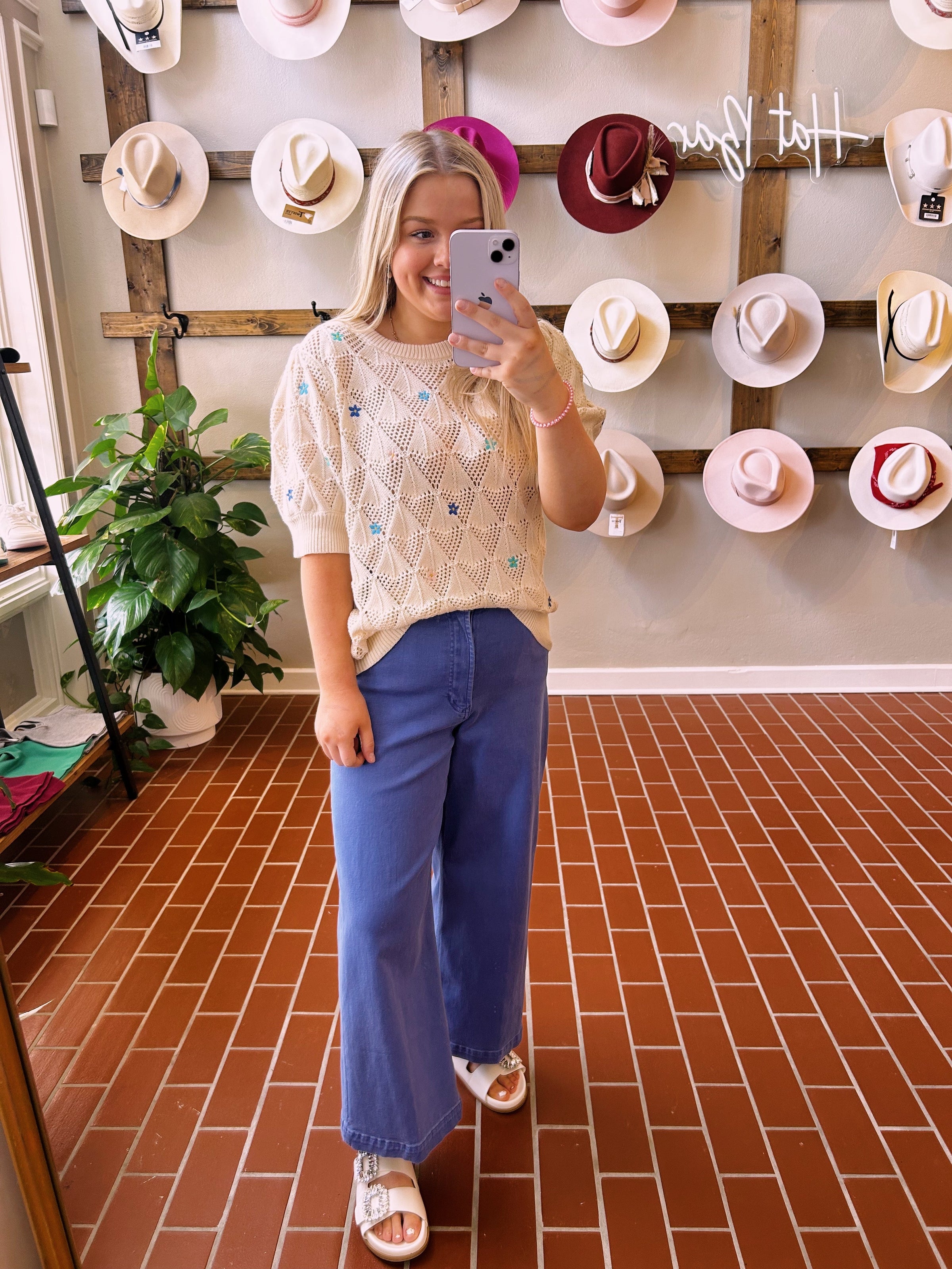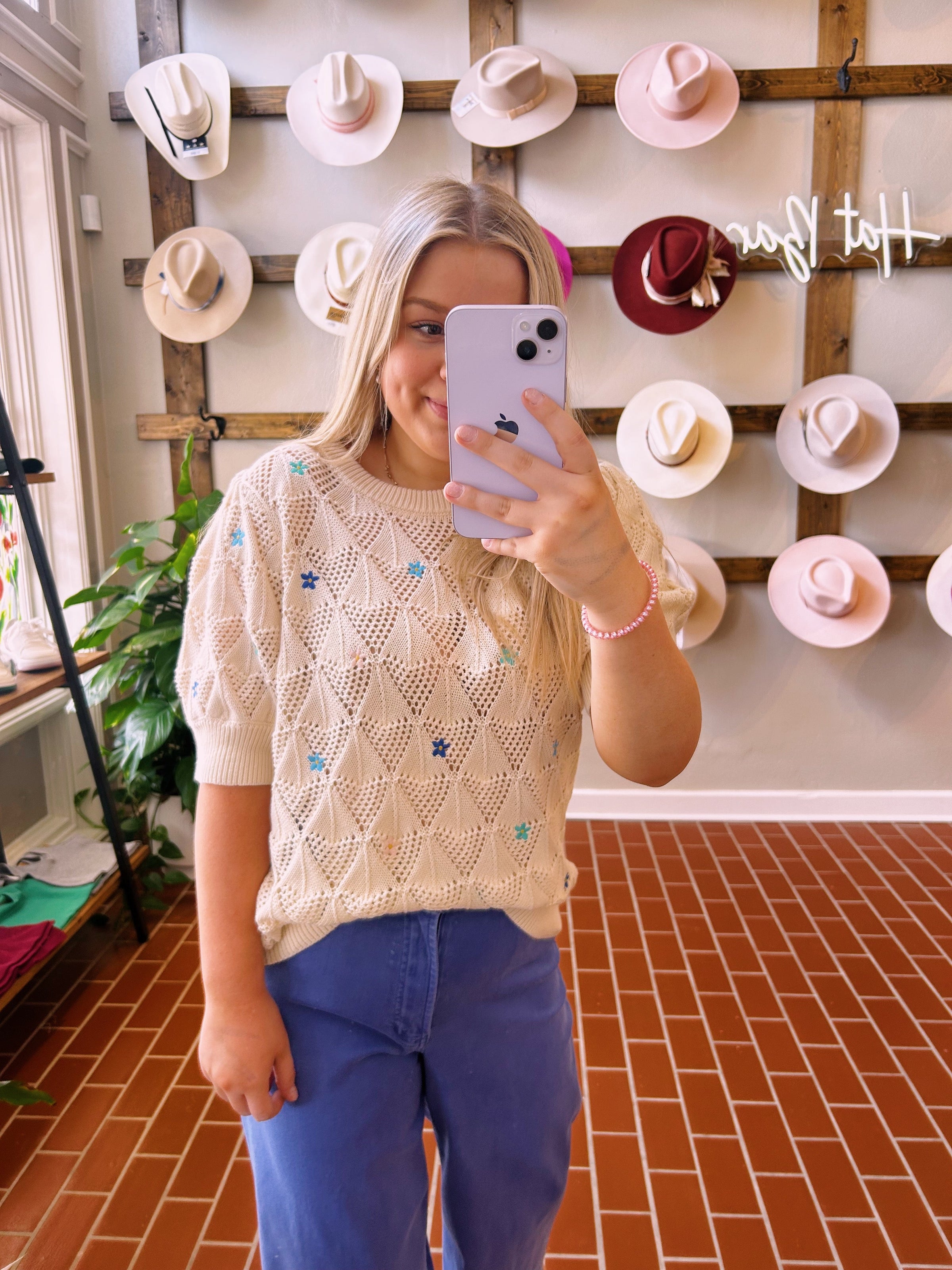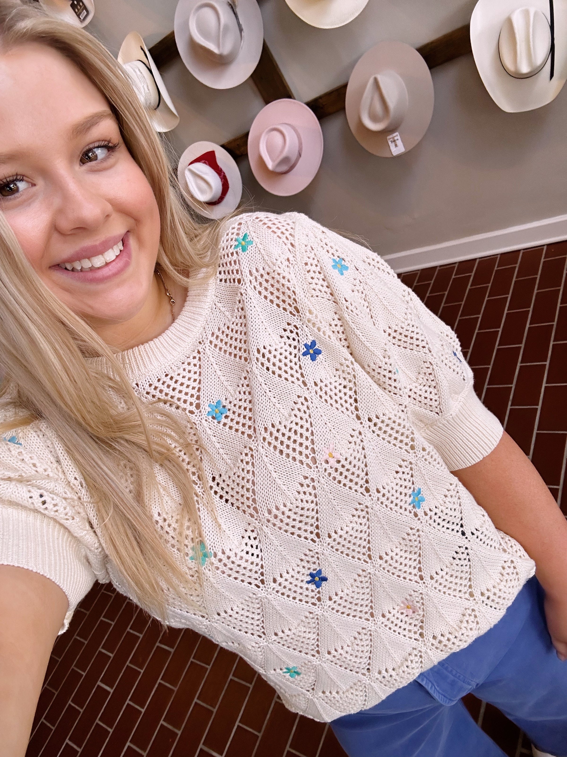 Introducing Another Love's Julia Cream Top - the perfect addition to your Spring and Summer wardrobe! With stunning flower embroidery and short sleeves, this sweater top pairs perfectly with Dear John's Hamptons or colored denim for cooler days. Get ready to stand out and bloom with style!
